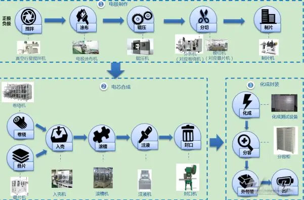在新能源快速發(fā)展的市場(chǎng)環(huán)境下,鋰離子電池的應(yīng)用可說(shuō)是目前新能源發(fā)展較為明顯的產(chǎn)業(yè),鋰離子電池是一個(gè)復(fù)雜的體系,包含了正極、負(fù)極、隔膜、電解液、集流體和粘結(jié)劑、導(dǎo)電劑等,涉及的反應(yīng)包括正負(fù)極的電化學(xué)反應(yīng)、鋰離子傳導(dǎo)和電子傳導(dǎo),以及熱量的擴(kuò)散等。鋰電池的生產(chǎn)工藝流程較長(zhǎng),生產(chǎn)過(guò)程中涉及有50多道工序。其生產(chǎn)工藝有一定差異,但整體上可將鋰電制造流程劃分為前段工序(極片制造)、中段工序(電芯合成)、后段工序(化成封裝)。